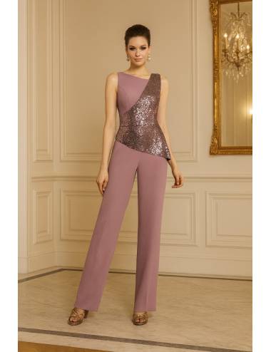 Mono de fiesta elegante en tono malva, con diseño asimétrico que combina crepé liso y un panel de lentejuelas rosadas que realza la figura. Su escote cerrado y el cuerpo estructurado estilizan el torso, mientras que el pantalón recto alarga visualmente las piernas. Ideal para invitadas que buscan sofisticación, brillo sutil y una silueta moderna y favorecedora.