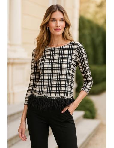 El top destaca por su diseño sofisticado y lleno de personalidad. Presenta un tejido estructurado con dibujo geométrico que aporta ritmo visual, mientras que el bajo rematado en suaves plumas añade un toque chic y muy actual. Su corte recto estiliza la figura y crea un equilibrio perfecto entre modernidad y elegancia, ideal para elevar cualquier look.
