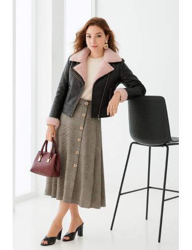 Cazadora negra estilo biker con un toque muy chic gracias a su interior y cuello de borreguito rosa pastel. Su diseño combina fuerza y dulzura, creando un look moderno y femenino. Incorpora cremalleras metálicas, puños vueltos y corte entallado que estiliza la figura. Ideal para elevar cualquier outfit con un punto actual y sofisticado.