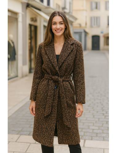 Abrigo largo de diseño elegante y atemporal, confeccionado en tejido cálido con textura jaspeada en tonos marrón y negro. Presenta solapa clásica, cierre con botón y cinturón para definir la figura. Su corte estilizado aporta comodidad y sofisticación, perfecto para looks diarios o más formales durante los días fríos.