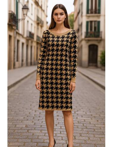 Vestido de punto de corte recto con estampado de pata de gallo grande que aporta un aire clásico y elegante. Presenta cuello redondo y mangas largas, ideal para los días frescos. Su tejido suave se adapta con comodidad al cuerpo, realzando la silueta de forma sutil. Perfecto para combinar con botines o tacones y crear un look sofisticado tanto para el día como para la noche.