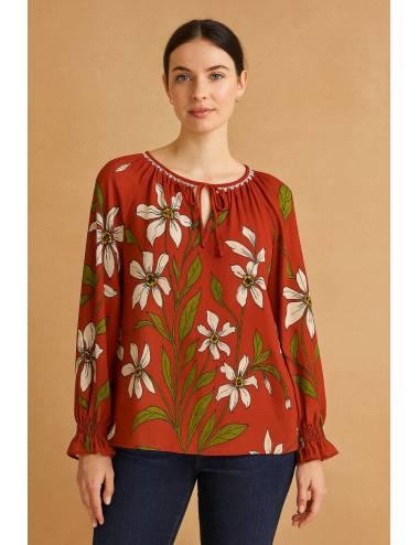 Blusa de manga larga con un estampado floral grande y vibrante que aporta un aire fresco y natural. Su cuello redondo con detalle fruncido y lazo central añade un toque delicado y femenino. El tejido fluido ofrece comodidad y movimiento, mientras que los puños elásticos crean un acabado elegante. Ideal para looks casuales con un punto sofisticado.