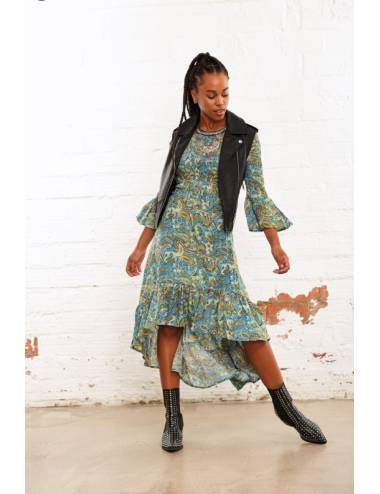 Vestido midi de estilo boho con corte asimétrico más largo por detrás y detalle de volantes en el bajo. Presenta mangas tres cuartos con acabado acampanado y un delicado estampado floral que aporta movimiento y frescura. Su tejido ligero y fluido lo convierte en una prenda ideal para un look moderno, femenino y lleno de personalidad.