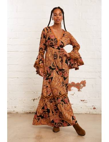 Vestido largo de estilo boho con escote en pico y mangas amplias acampanadas. Su corte fluido y cintura ligeramente ajustada realzan la silueta con elegancia. El estampado paisley aporta un aire exótico y artístico, ideal para crear looks con personalidad. Perfecto para combinar con botas o sandalias, logrando un estilo libre y sofisticado.