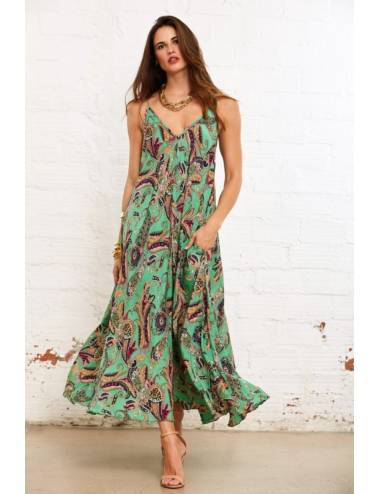 Vestido largo estampado, con tirantes, escote en pico y falda de vuelo con abertura.