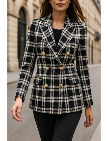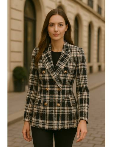Chaqueta de estilo inglés con elegante estampado de cuadros en tonos negros y crudos. Su diseño cruzado con seis botones dorados aporta un toque sofisticado y atemporal. Entalla la figura de forma favorecedora y combina a la perfección con looks urbanos, modernos y muy chic. Ideal para otoño e invierno.