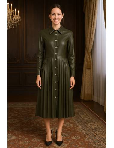 Vestido midi de efecto piel con falda plisada y botones dorados frontales. Su diseño entallado con cuello camisero y mangas largas combina elegancia y modernidad, ideal para un look sofisticado y femenino.