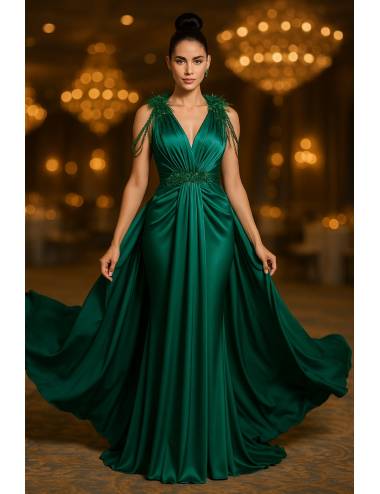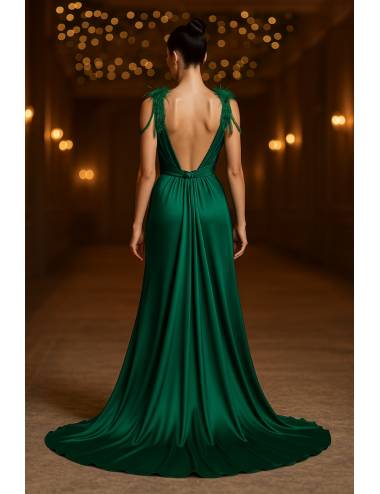 Vestido de gala confeccionado en satén verde esmeralda con una caída fluida y elegante. Su diseño destaca por la espalda completamente al aire, realzada con detalles de pedrería y plumas en los hombros que aportan un toque de lujo. La falda se abre con una caída suave desde la cintura, creando una silueta sofisticada y femenina, perfecta para eventos de noche o alfombra roja.