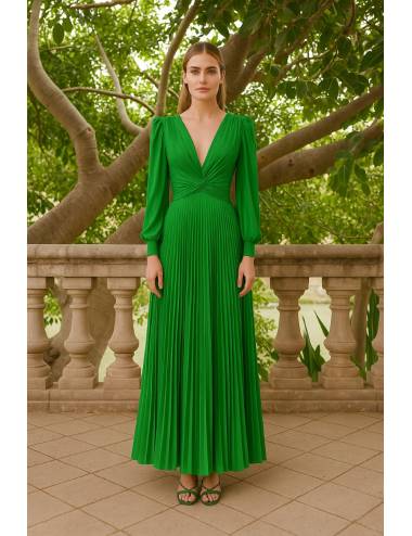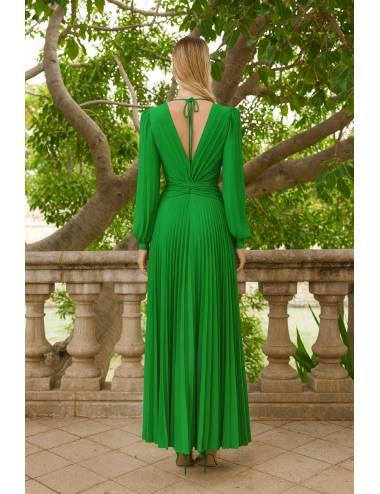 Vestido largo plisado con escote en pico en la espalda y lazada al cuello, que aporta un toque delicado y femenino. Su diseño ajustado en la cintura realza la figura, mientras que la falda de vuelo crea un movimiento elegante y fluido. Las mangas largas con puño aportan equilibrio al conjunto, logrando una silueta sofisticada y perfecta para eventos de día o de noche.