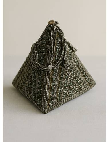 Bolso de mano con forma piramidal, elaborado con un exquisito trabajo de cuentas metálicas y pequeñas piedras que crean un dibujo simétrico y elegante. Su diseño estructurado y su brillo sutil lo convierten en una pieza sofisticada, perfecta para eventos de noche o celebraciones especiales. El cierre tipo cordón añade un toque artesanal y refinado, realzando su carácter único y distinguido.