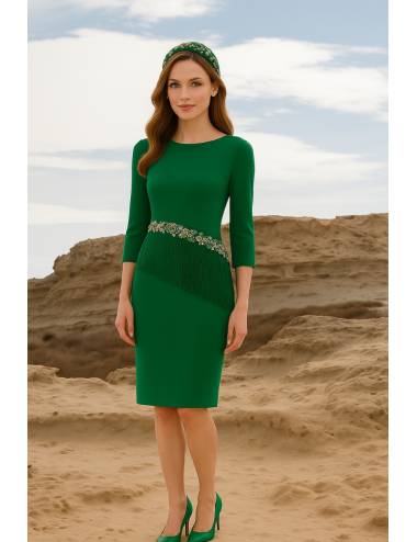 Vestido midi sin mangas en tono bugambilia, ideal para eventos elegantes o celebraciones de día. Su diseño sobrio con cuello cerrado se equilibra con un delicado fruncido lateral adornado con flor, que estiliza la figura y aporta un toque original. Un modelo cómodo, femenino y sofisticado, perfecto para destacar con elegancia.