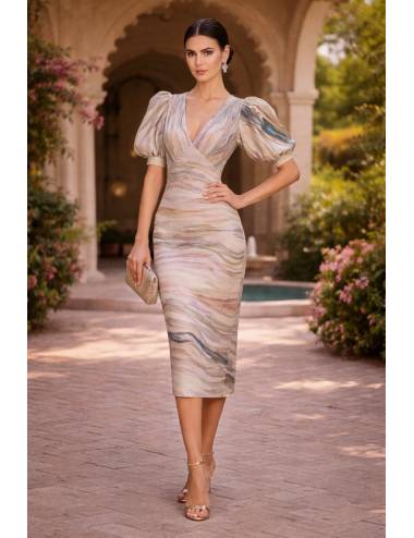 Este vestido midi destaca por su sofisticado estampado acuarela en tonos lavanda, rosa y verde suave, creando un efecto etéreo y muy favorecedor. Su escote cruzado realza la figura, mientras que las mangas abullonadas aportan un toque romántico. Ajustado en la cintura y con caída elegante, es perfecto para invitadas que buscan estilo, frescura y distinción.
