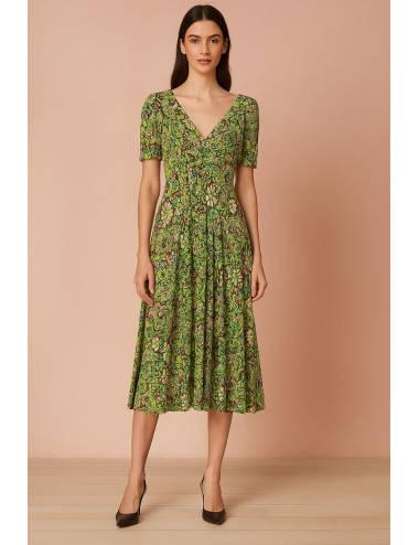 Vestido midi de corte evasé con estampado floral multicolor en tonos cálidos. Presenta escote en pico, botones decorativos en el frontal y mangas con volantes que aportan un toque femenino. La falda lleva cortes en capas que añaden movimiento. Espalda cerrada sin escote. Ideal para días soleados y ocasiones informales.