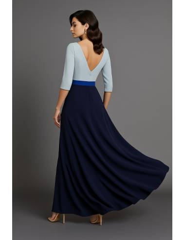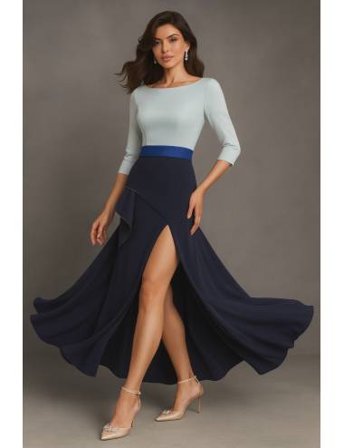 Elegancia con movimiento. Este vestido bicolor combina un cuerpo de tono celeste con escote en V en la espalda y manga francesa, aportando sutileza y distinción. La falda azul marino con cinturón a contraste realza la figura y cae con una fluidez impecable. Un diseño sofisticado y moderno, ideal para invitadas que buscan estilo, clase y personalidad.