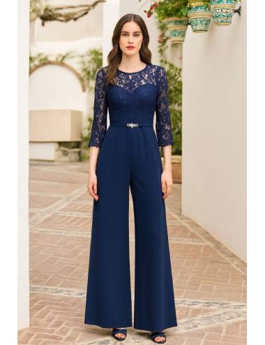 Elegante vestido largo de fiesta confeccionado en un tono azul profundo. El diseño combina un cuerpo de encaje floral con mangas tres cuartos y escote en pico, aportando sofisticación y feminidad. La cintura está realzada con un delicado detalle de pedrería que marca la silueta y da un toque de brillo. La falda fluida cae hasta los pies con abertura lateral, que añade movimiento y un aire seductor. Ideal para bodas, galas y eventos especiales.