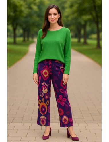 El pantalón de estampado artístico combina tonos intensos de morado, fucsia y mostaza en un diseño original y elegante. Su tejido fluido y corte recto estilizan la figura, aportando un aire moderno y sofisticado. Se complementa con un suéter verde de textura suave, creando un contraste vibrante pero armonioso. Los zapatos de tacón bajo en tono bugambilla completan el look con un toque femenino y refinado, ideal para un outfit de día con personalidad y encanto.