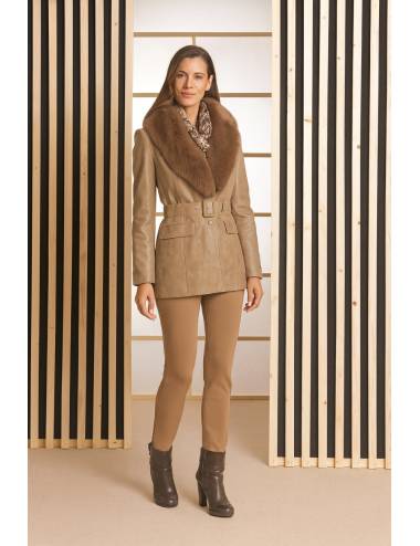Chaqueta de piel entallada y con pelo en el cuello que se puede quitar. Las tenemos en color marrón clarito y en negro.