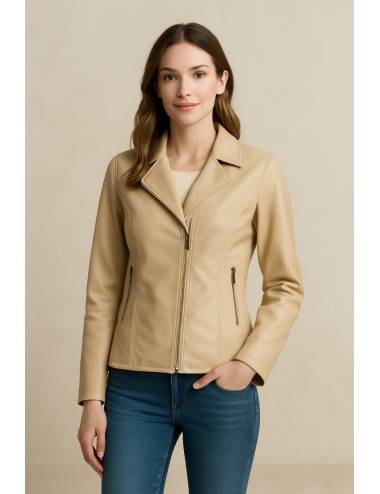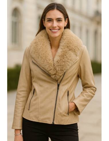 Chaqueta beige de polipiel suave con diseño entallado que realza la figura y aporta un aire moderno y elegante. Su cuello de pelo desmontable permite dos estilos en una sola prenda: con el cuello de pelo, para un look más cálido y sofisticado, o sin él, para un estilo más limpio y casual. Ideal para combinar con jeans o vestidos, adaptándose a cualquier ocasión con elegancia y versatilidad.