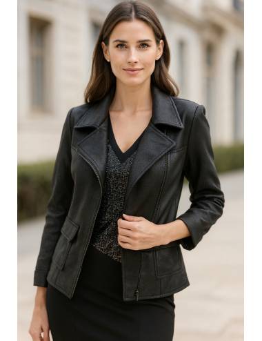 Chaqueta de piel sintética en tono granate, elegante y muy favorecedora. Su diseño entallado estiliza la figura, con costuras marcadas que aportan estructura y un acabado sofisticado. Incorpora cremallera central, cuello mao con broche y bolsillos laterales con cierre metálico. Un modelo moderno, femenino y perfecto para looks casuales y urbanos con un toque chic.