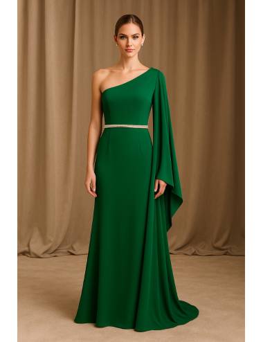 Vestido largo de gala en tono verde elegante, con diseño asimétrico de un solo hombro y caída fluida que cubre suavemente la mano. Su corte entallado realza la figura, mientras que el tejido satinado aporta movimiento y sofisticación. Destaca el detalle del cinturón con pedrería, que aporta un toque de brillo sutil y glamour. Perfecto para eventos de noche o celebraciones especiales