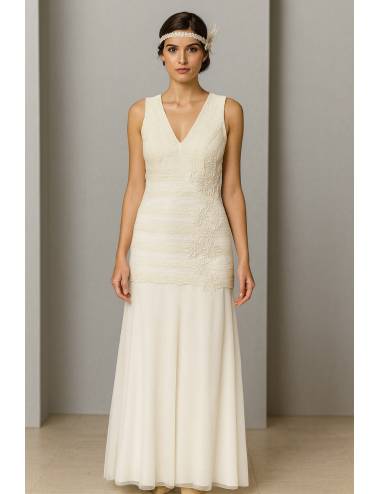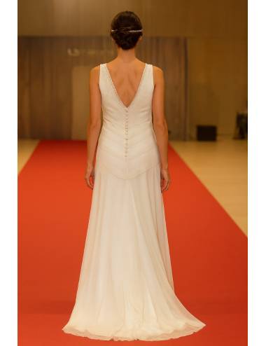 Vestido de novia de estilo elegante y delicado, con escote en V tanto en la parte delantera como trasera. El cuerpo, ajustado y realzado con finas franjas de encaje, estiliza la silueta, mientras que la falda de tul cae suavemente formando una cola fluida. Los botones forrados en la espalda aportan un toque clásico y sofisticado, ideal para una novia de gusto refinado.