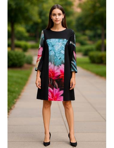 Vestido corto de corte recto con base negra y estampado artístico en tonos azules y florales. Las mangas amplias aportan elegancia y movimiento, mientras que los tacones completan un look moderno, femenino y sofisticado.