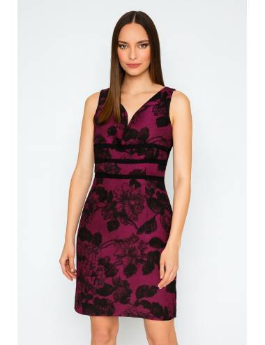Vestido corto sin mangas en tono bugambilla con elegante estampado floral en negro. Su tejido con textura aporta cuerpo y sofisticación, mientras que los detalles de bandas negras en la cintura realzan la silueta. Con escote en pico y corte entallado, es una prenda ideal para eventos, cenas o celebraciones donde destacar con estilo y feminidad.