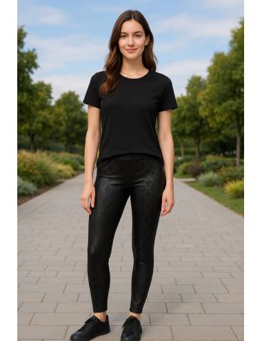 Leggings con textura efecto serpiente en tono negro satinado, de talle medio y corte ajustado que estiliza la figura. Su tejido elástico se adapta perfectamente al cuerpo, aportando comodidad y un toque sofisticado. La modelo los combina con una camiseta negra básica y zapatillas del mismo tono, logrando un look urbano, moderno y elegante ideal para el día a día o para un outfit casual con estilo.