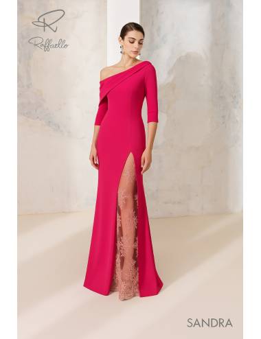 Vestido largo con un original escote ladeado y con su manga francesa. Silueta ajustada en su parte de arriba y la falda recta con un corte lateral.