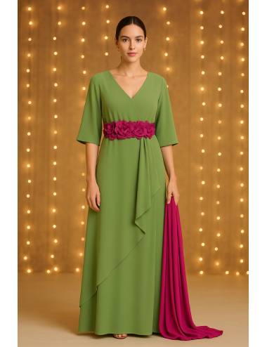 Vestido largo de fiesta en tono verde suave, con un diseño cruzado que realza la figura y aporta elegancia natural. Las mangas tres cuartos ofrecen caída fluida y el cinturón fucsia con flores en relieve enmarca la cintura aportando contraste y luminosidad. El chal a juego en el mismo tono fucsia completa el conjunto con un toque sofisticado y armonioso, ideal para invitadas que buscan un look distinguido, alegre y muy favorecedor.