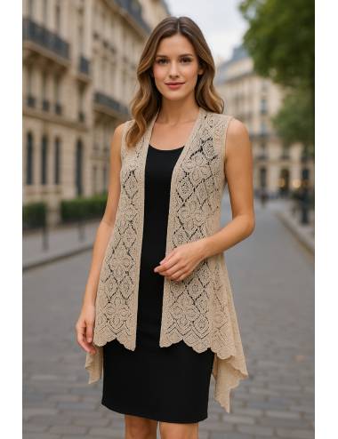 Chaleco de encaje beige con un diseño floral delicado y elegante. Su caída ligera y el acabado en picos aportan movimiento y un estilo boho-chic muy sofisticado. Combinado con un vestido negro, realza la figura y crea un conjunto armonioso y versátil, perfecto para eventos, tardes de verano o looks casuales con un toque refinado.