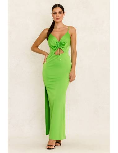 Vestido largo de tirantes finos con escote recto y favorecedor drapeado en la cintura. La falda presenta una abertura lateral que aporta sensualidad, mientras que la espalda cruzada con tiras ajustables crea un efecto llamativo y elegante. Ideal para eventos de noche con un toque moderno.