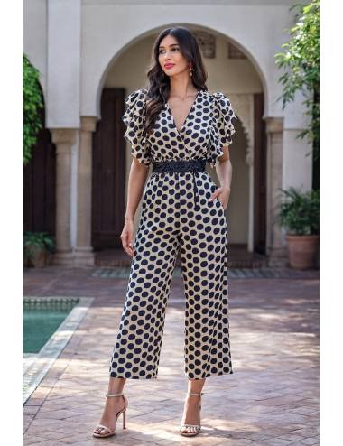 Mono de inspiración elegante y femenina, estampado con lunares en contraste que aportan un estilo clásico y actual. Su diseño cruzado con escote en pico favorece la figura, mientras las mangas con volantes aportan volumen y movimiento. La cintura se ajusta con un delicado cinturón de encaje que define y estiliza. El pantalón amplio y recto crea una silueta fluida y sofisticada, perfecta para eventos y celebraciones con un toque original.