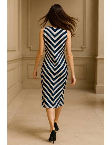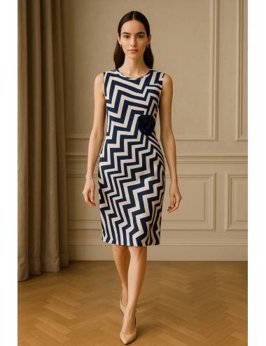 Vestido recto sin mangas con estampado geométrico en zigzag en tonos marino y blanco. De corte midi y cuello redondo, incluye un adorno floral en el lateral que aporta un toque original y femenino. Ideal para eventos de día, celebraciones urbanas o looks primaverales con estilo moderno y sofisticado.
