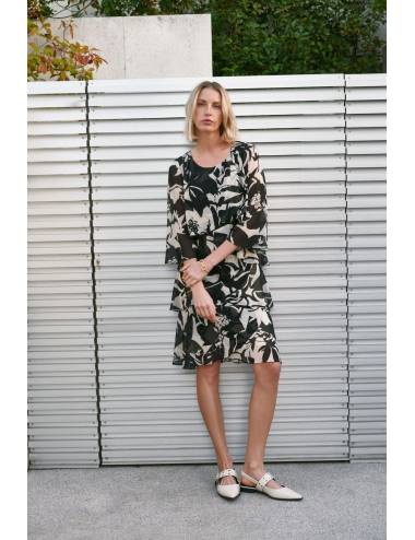 Vestido ceñido con manga francesa y transparente. Cintura ceñida con un volante alrededor y caída en el mismo lateral que el corte.