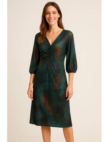 Vestido corto de estilo moderno con un estampado abstracto en tonos verdes, azules y cobrizos con un sutil acabado brillante. Presenta un favorecedor escote en pico con frunce central que estiliza el busto y mangas tres cuartos con puño elástico que aportan comodidad y un aire juvenil. La falda cae por encima de la rodilla, creando un look fresco, alegre y elegante, perfecto para ocasiones semi-formales o eventos nocturnos donde se busque destacar con estilo.