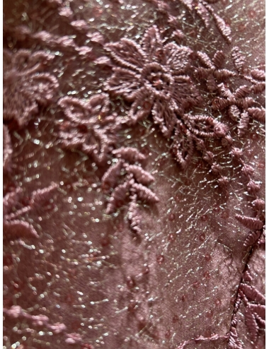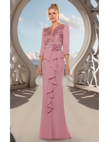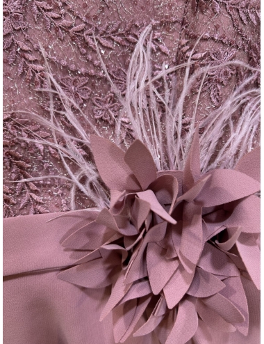 Vestido largo de fiesta, con cuerpo de encaje y lentejuelas, cuello acabado en pico, la manga es francesa con cintura marcada con cinturon y detalle de flores con plumas, de la que sale un volante acabado en cascada, es ideal para madrinas y eventos a los que quieras ir muy elegante