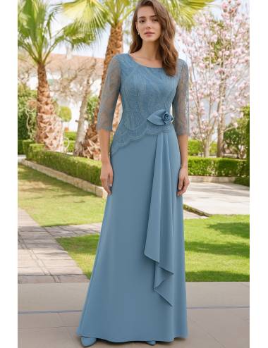 Elegante vestido largo en tono azul empolvado, ideal para eventos de día o de tarde. Su cuerpo de encaje con manga francesa aporta sofisticación, mientras que la falda lisa con caída fluida estiliza la figura. Destaca el detalle floral en la cintura que añade un toque romántico y favorecedor. Un diseño perfecto para invitadas que buscan distinción y dulzura en su look.