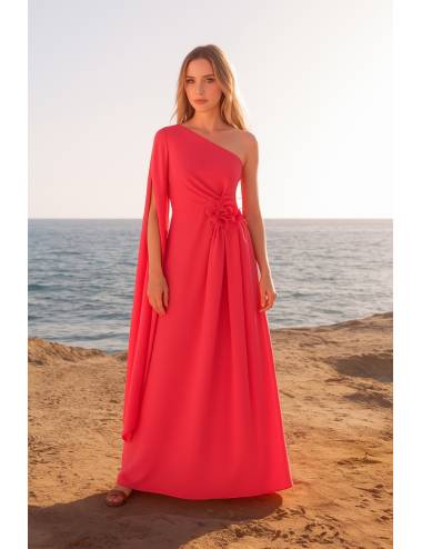 Vestido largo de un solo hombro en color fresa, con caída fluida y elegante. Destaca su diseño asimétrico con una capa ligera que cae desde el brazo, aportando movimiento y sofisticación. En la cintura, una flor del mismo tono realza la figura con sutileza. Perfecto para invitadas que buscan un look romántico, moderno y lleno de luz para eventos al aire libre.