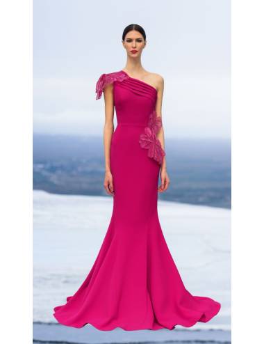 Un vestido largo y entallado que realza la silueta con elegancia y sofisticación. Este diseño cuenta con un corte asimétrico, dejando un hombro al descubierto y aportando un toque sensual y moderno. La manga única es larga y ajustada, estilizando el brazo . El detalle protagonista del vestido es una flor elaborada en el hombro cubierto, confeccionada con delicados pliegues que simulan pétalos y que desprende un colgante de tul etéreo. Un diseño perfecto para destacar en cualquier evento o celebracion.