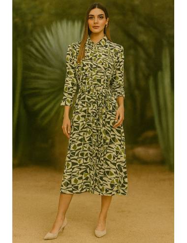Vestido camisero midi con estampado geométrico en tonos verdes y negros sobre fondo claro. Presenta cuello clásico, botones delanteros y bolsillos en el pecho, además de cinturón a juego que marca la cintura y estiliza la silueta. De manga larga y tejido ligero, es una prenda versátil y fresca, perfecta para un look casual con estilo o para un outfit más arreglado con tacones.