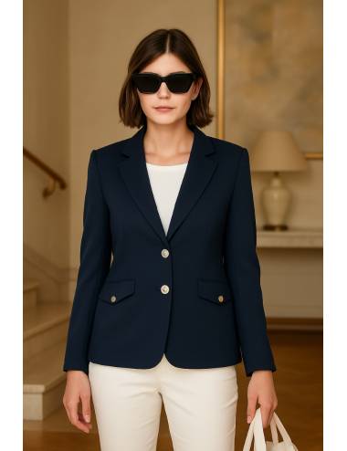 Chaqueta americana entallada con botones metálicos y bolsillos con solapa. Disponible en blanco o azul marino, es ideal para elevar cualquier look con un toque elegante y moderno. Perfecta para combinar con jeans o pantalones de vestir, tanto en looks de oficina como casual chic.