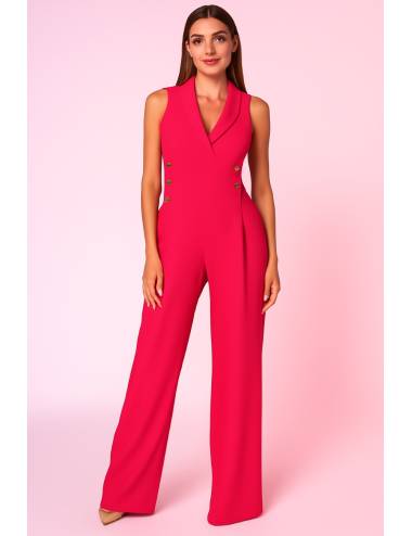 Mono largo sin mangas en un vibrante tono fresa ácida, con escote cruzado tipo blazer y detalles de botones dorados a ambos lados de la cintura que estilizan la figura. Su corte palazzo alarga visualmente las piernas, logrando un look elegante, moderno y con mucha personalidad. Ideal para eventos, fiestas o graduaciones donde quieras destacar con estilo.