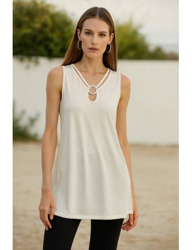 Top sin mangas en color blanco, de corte recto y tejido fluido que se adapta con suavidad al cuerpo. Destaca por su escote redondo adornado con tiras dobles que se cruzan en un aro metálico central, aportando un detalle elegante y moderno. Una prenda versátil y fresca, ideal para combinar con pantalones o faldas, perfecta tanto para looks casuales como más sofisticados.
