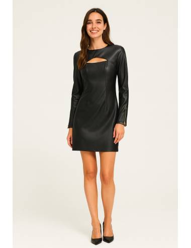 Vestido corto de efecto piel con diseño ajustado que realza la silueta. Presenta escote original con abertura frontal y mangas largas con cremalleras doradas en los puños. Una prenda moderna y sofisticada, perfecta para lucir un look elegante con un toque atrevido.