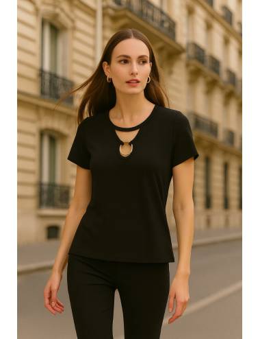 Blusa negra de manga corta con escote redondo decorado con un aro metálico dorado y abertura en forma de lágrima, que aporta un toque moderno y sofisticado. De corte recto y tejido suave, es una prenda versátil ideal para combinar con pantalones o faldas, perfecta para un look urbano elegante y actual.