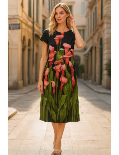 Vestido midi de fondo negro con mangas cortas y escote redondo. El diseño destaca por un llamativo estampado floral de calas en tonos rojos y verdes que cubre toda la parte inferior del vestido y asciende hasta el pecho. De corte recto y elegante, es ideal para ocasiones especiales o para un look sofisticado y fresco.