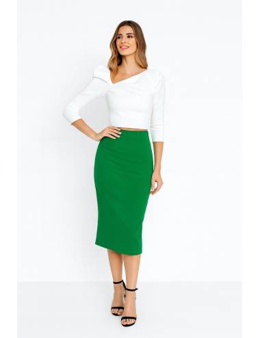 Conjunto elegante y sofisticado compuesto por un top blanco asimétrico de manga francesa con detalle drapeado en el hombro, que realza la silueta con un toque moderno y minimalista. Se combina con una falda lápiz de talle alto en color verde intenso, ajustada y de largo midi, que estiliza la figura y aporta frescura y elegancia al look. Ideal para eventos de día, celebraciones o invitadas que buscan destacar con estilo y sencilleza.