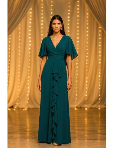 Vestido largo de corte elegante con un diseño envolvente que realza la silueta femenina. Presenta un delicado escote en pico y mangas tipo capa que aportan movimiento y ligereza. La falda fluida cae hasta el suelo con un detalle de volantes en cascada que estiliza la figura. Ideal para eventos de gala o ceremonias, destaca por su sofisticación y caída impecable.