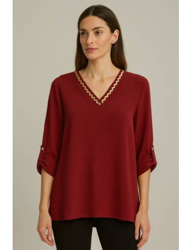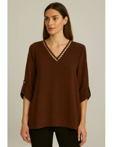 Blusa de corte recto con escote en pico decorado con delicado vivo en zigzag metálico, que añade un toque artesanal y elegante. Confeccionada en tejido suave de textura ligeramente arrugada, incorpora mangas tres cuartos con trabilla y botón, que permiten ajustar el largo con estilo. Versátil y cómoda, ideal para looks casuales o más sofisticados.